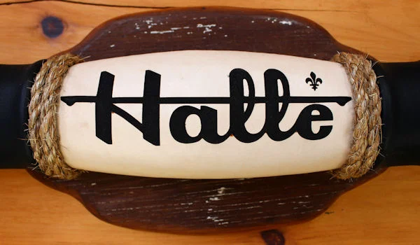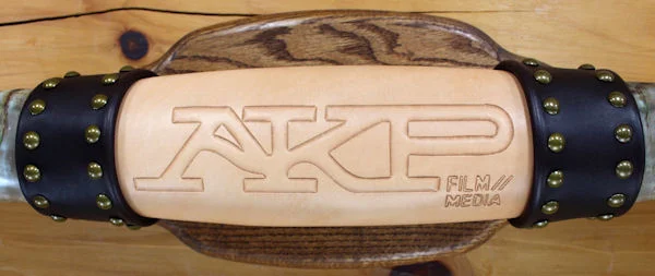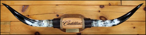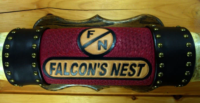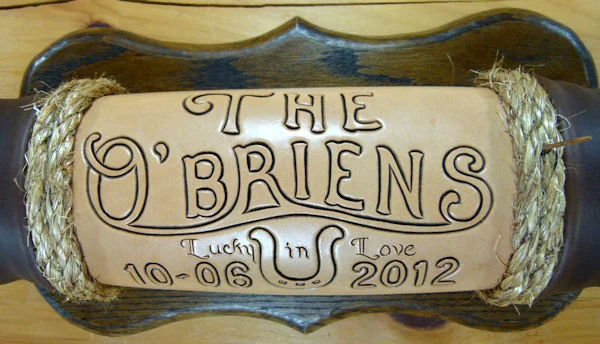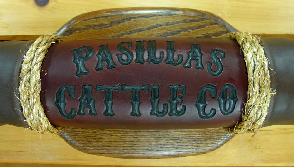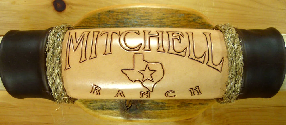 There are many different options for customizing your horn mount. Any of the horns listed on the Mounted Longhorn page can be customized. For customized leather you can call or email your ideas or logos that you would like used. Another option is to have an engraved plate screwed to the wooden mounting plaque. For ideas see examples below.