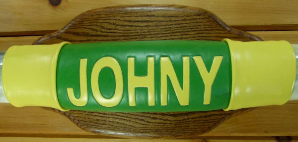 This customer wanted bright John Deere colors, so the letters were cut out and the yellow was stitched in behind. Added cost $250.